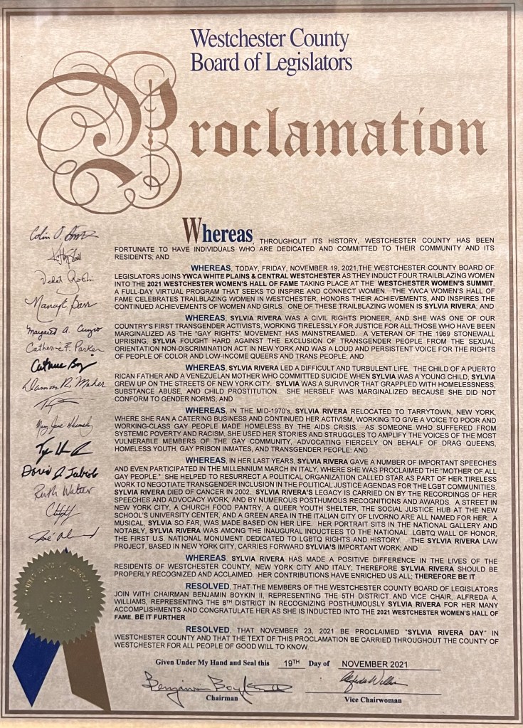 In 2021, the Westchester County Board of Legislators issued a proclamation posthumously inducting Rivera into the 2021 Westchester Women’s Hall of Fame and pronouncing November 23, 2021 “Sylvia Rivera Day.”