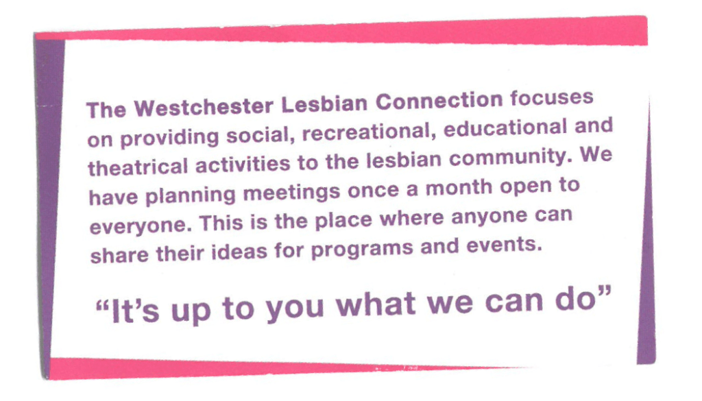 Westchester Lesbian Connection ran for nearly 20 years. During this time, the self-sustaining group provided a space for lesbians to learn, socialize, perform, and more. Highlights from these years that Donna discusses in this interview include a trip to the Lesbian Herstory Archives in Brooklyn, NY, a performance run of “The Vagina Monologues” (which raised $300 for My Sisters Place), and various social events like picnics and dances.