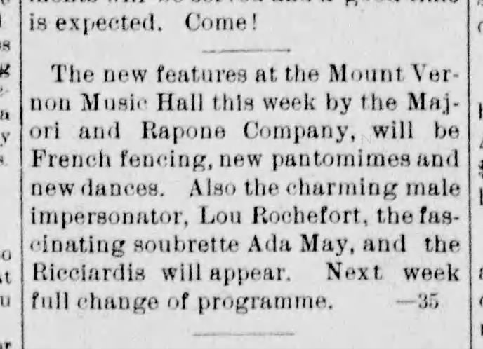 Given its proximity to New York City, it is unsurprising that drag/impersonation performance made its way to Westchester prior to most other places in the country on a number of recorded occasions. The first of these advertised performances discovered by the Westchester LGBTQ+ History Project occurred in 1897. In this performance, “male impersonator” Lou Rochefort appeared at the Mount Vernon Music Hall.