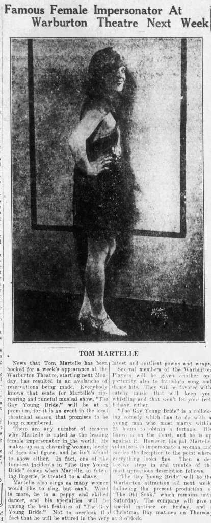 Editors Note: The gender identity or sexual orientation of any performer mentioned in this post is not something one can expect to ascertain simply based on the historical record. The Westchester LGBTQ+ History Project makes no attempt to infer how these performers identified at the time or how they might identify if they were alive today. However, various gender and sexuality scholars have posited the notion that drag/impersonation/illusion performance in the 19th and early 20th century can be viewed as inherently queer as a phenomena that intentionally subverted heteronormative/gendered cultural roles.