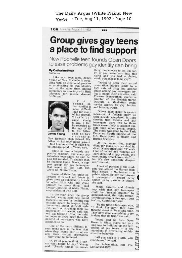Today, Young is a professor at Monroe College as well as a musical artist (I.Den.t.T) and the founder of Queery, a nonprofit focused on presenting queer theory to the general public in accessible, appealing, and fun ways. He is also a husband and father with ample friends and chosen family here in Westchester, where he remains active in community building.